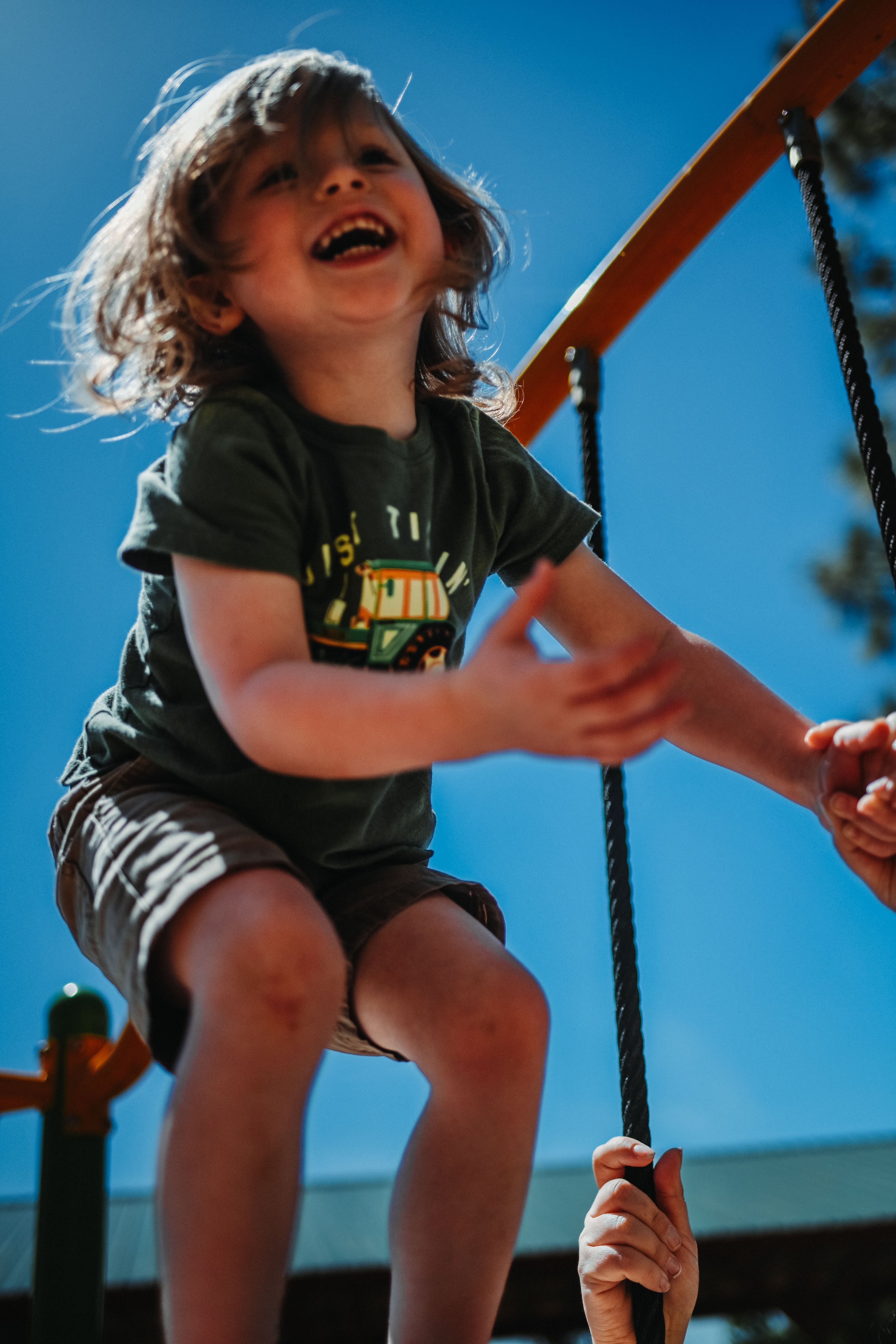 She wasn't watching from a bench. She was right there — recruited, drafted, fully on duty — steadying him here, spotting him there, following his lead from one end of that playground to the other without missing a beat. This is what it looks like to mother a wild one. You don't direct the storm. You run alongside it.